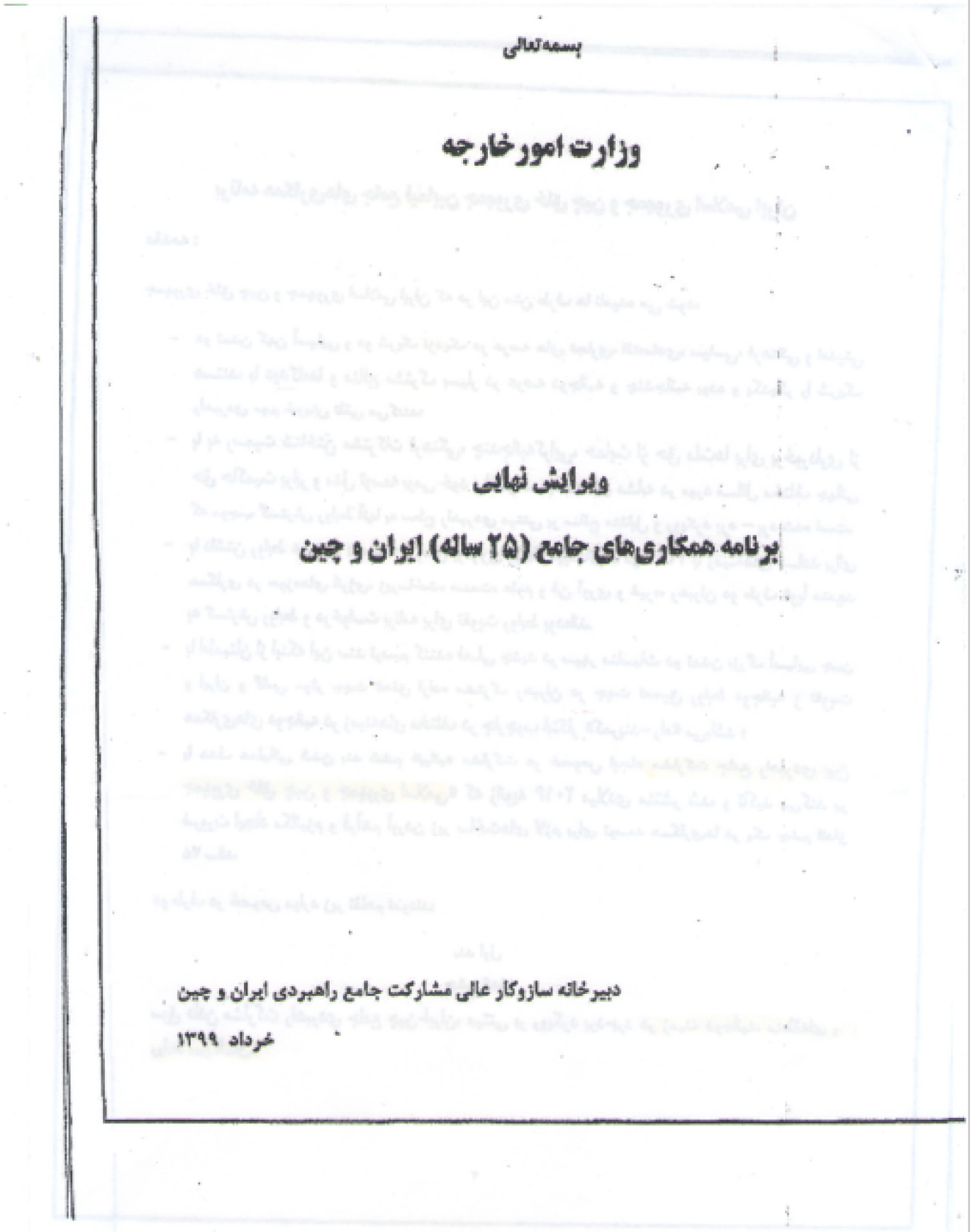 پیش از هرچیز ذکر این نکته لازم است که هیچ متن رسمی از قرارداد ۲۵ ساله ایران و چین منتشر نشده است. اما نیویورکتایمز سال گذشته متنی منتشر کرد که «ویرایش نهایی برنامه همکاریهای جامع ۲۵ ساله ایران و چین» نام دارد. هرچند منابع رسمی این متن را تایید نکردند اما بسیاری از جمله مقاماتی در جمهوری اسلامی، همان را مرجع گفتههای خود قرار دادهاند. این نوشته نیز آن متن را مبنی قرار دادهاست و هرجا به «قرارداد ۲۵ ساله» اشاره میشود منظور همان متن تایید نشده است.