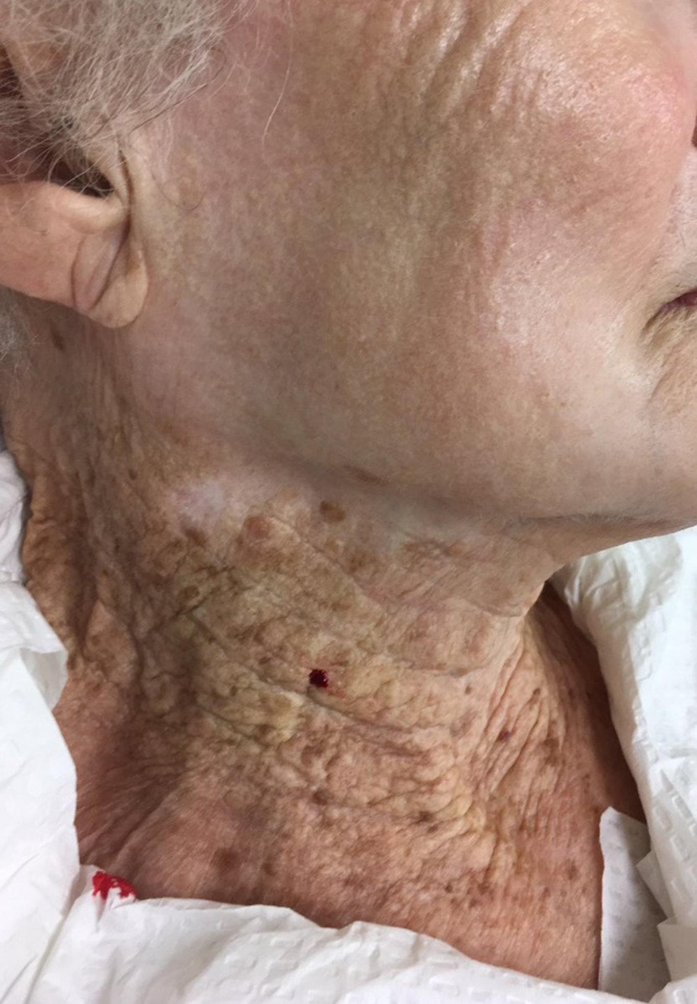 Cheek and neck of a 92-year-old female, who used UV-protective moisturizers on her face but not on the neck for 40+ years.https://t.co/Q8wWxY2tDE pic.twitter.com/FBSswmYxt1