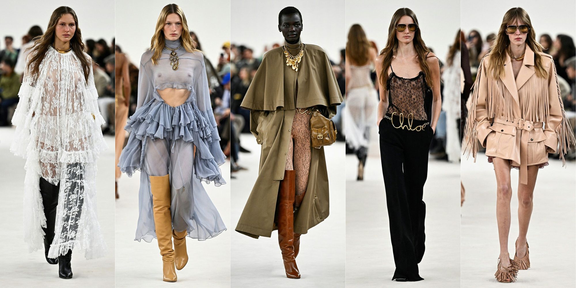 ترکیب مواد متضاد: مهمترین تجلی این ترکیب همراهی پارچههای شیفون و حریر با چرم است که حد اعلای آن را در کلوئه پاییز و زمستان ۲۰۲۴ دیدیم.