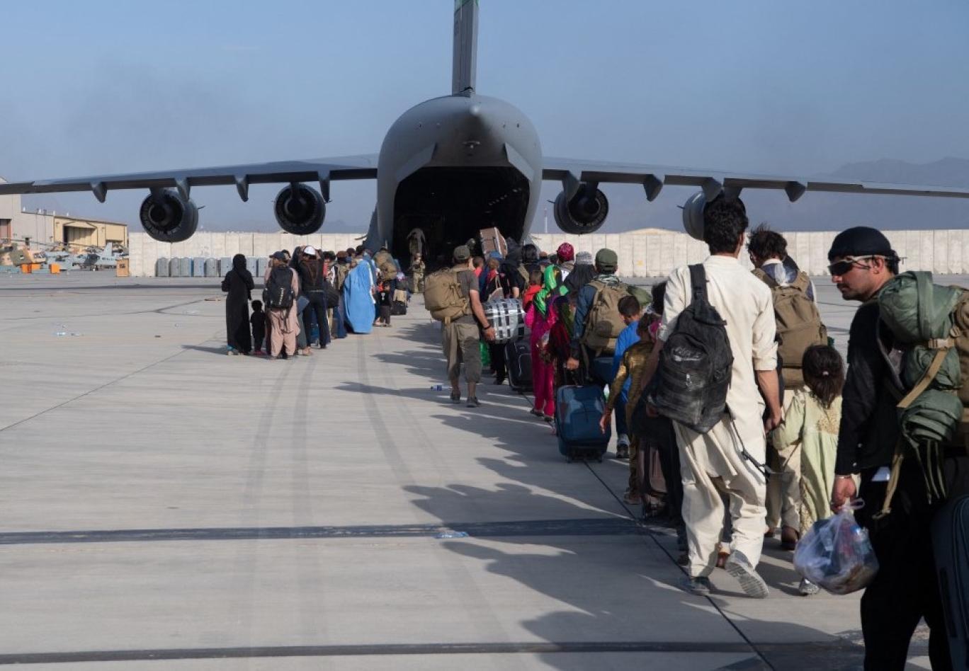 گروهی از افغان‌ها در حال ورود به هواپیمای ارتش آمریکا در جریان عملیات تخلیه نظامی‌ــAFP