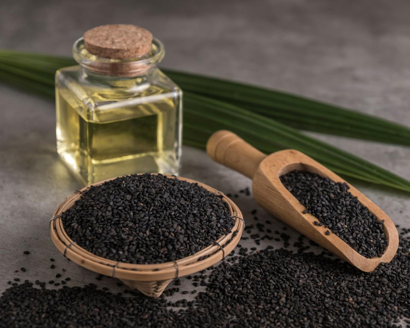 عکس تزیینی‌ــ دانه‌ها و روغن کنجد سیاه در تصویر مشاهده می‌شود‌ــ Canva