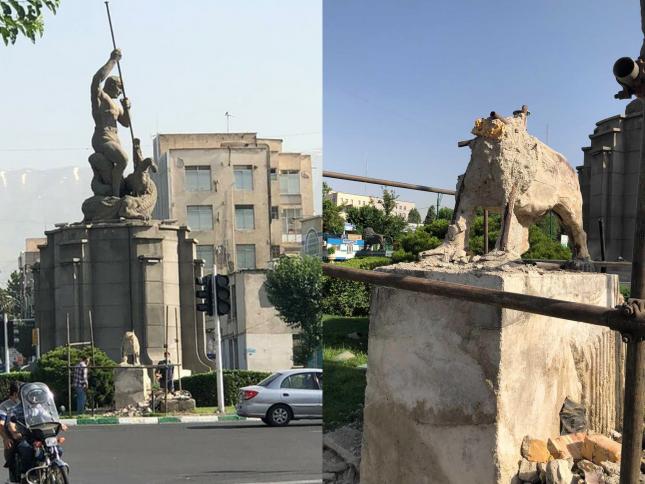 از مجسمهای که نیمتنه جلویی آن تخریبشده بود، چیزی جز یکتکه سیمانی کوچک باقی نمانده است