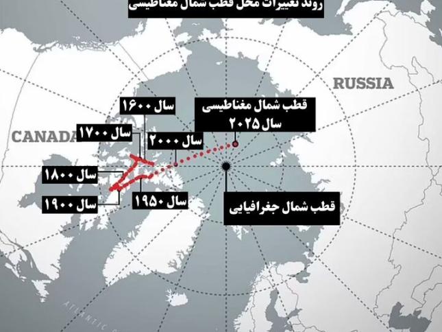 حرکت این قطب به دلیل تکانها و آشفتگیهای غیرقابلپیشبینی در جریان آهن مذابی است که بیشتر قسمت خارجی هسته زمین را تشکیل میدهد، قطب مغناطیسی به مدت قرنها در امتداد سواحل شمالی کانادا حرکت کرده بود