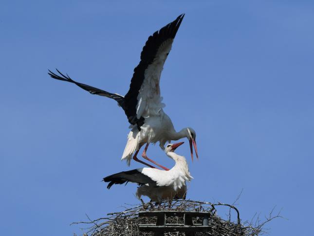این جفت لک لک بالای یک درخت بلوط قدیمی در حال مراقبت از سه تخم هستند